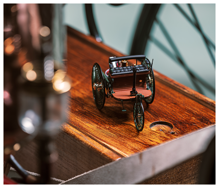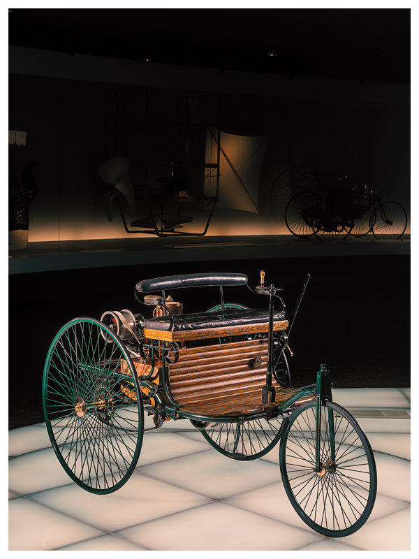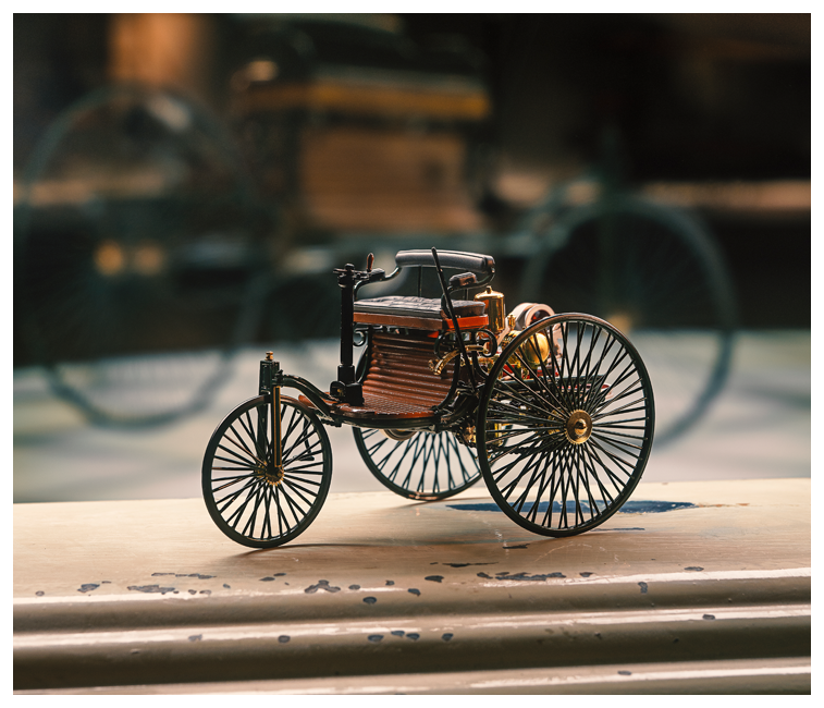 Benz hat es als Dreirad ausgeführt, da er von der bei Kutschen üblichen Drehschemellenkung nicht überzeugt ist. Die entscheidende Leistung von Carl Benz besteht in der Konsequenz, mit der er seine Vision vom „Wagen ohne Pferde“ zur Realität werden lässt.